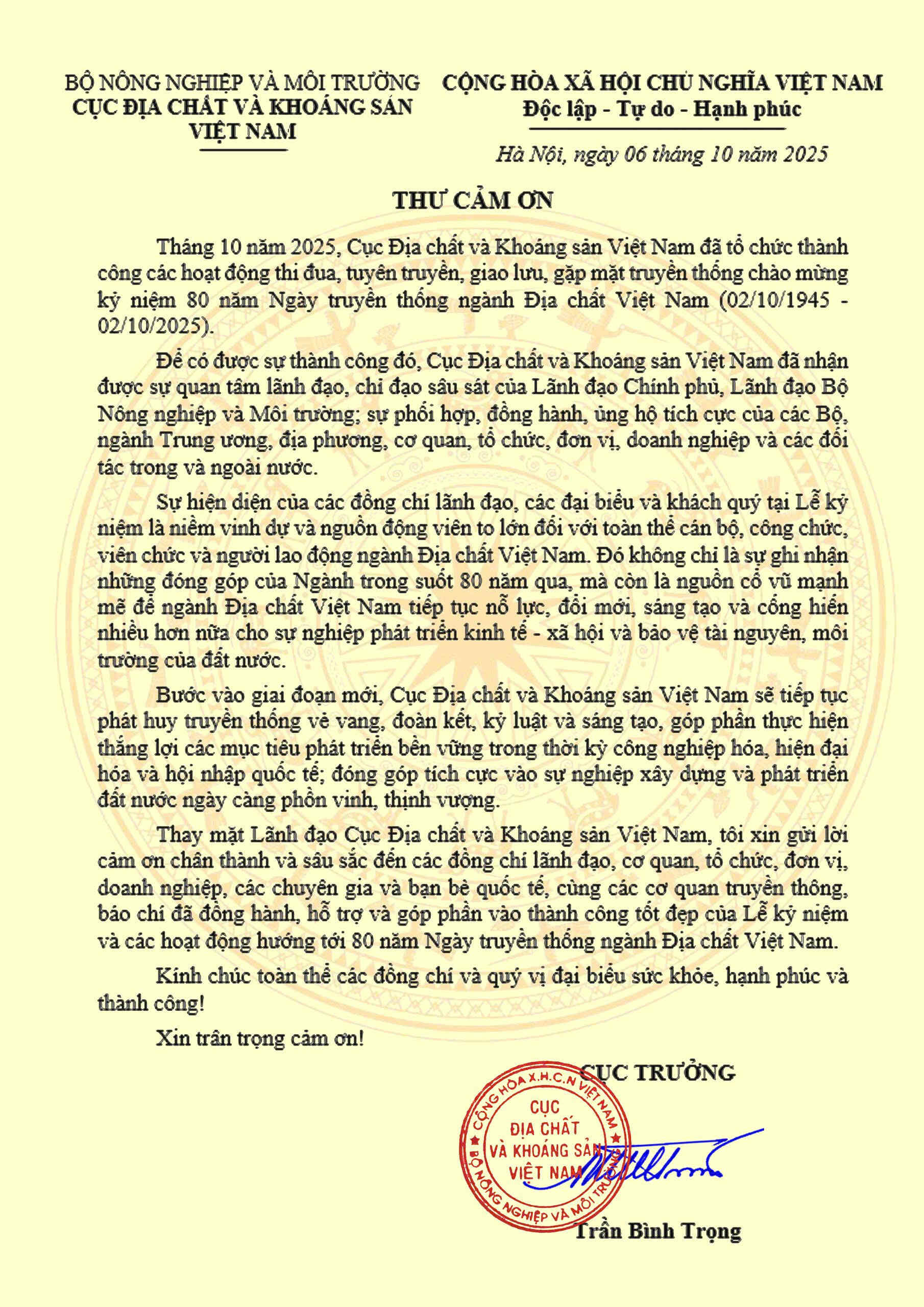 Thay mặt Cục Địa chất và Khoáng sản Việt Nam, Cục trưởng Trần Bình Trọng gửi Thư cảm ơn các đồng chí lãnh đạo, cơ quan, tổ chức, đơn vị, doanh nghiệp, các chuyên gia và bạn bè quốc tế, cũng các cơ quan truyền thông, báo chi đã đồng hành, hỗ trợ và góp phần vào thành công tốt đẹp của Lễ kỳ niệm và các hoạt động hướng tới 80 năm Ngày truyền thống ngành Địa chất Việt Nam (02/10/1945 - 02/10/2025)